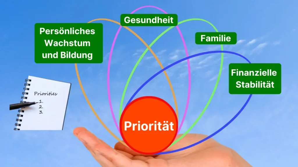 Unsere Prioritäten sind die Basis, auf der wir unsere Ziele aufbauen. Ohne Gesundheit, Bildung oder finanzielle Stabilität wird es schwierig, langfristig erfolgreich zu sein. Jede Priorität ist wie ein Baustein, der uns hilft, unser Leben in Balance zu halten und unsere Träume zu verwirklichen. Indem wir klare Prioritäten setzen, schaffen wir eine stabile Grundlage, um auf unsere Ziele hinzuarbeiten – ob es persönliches Wachstum, familiäre Harmonie oder beruflicher Erfolg ist.
